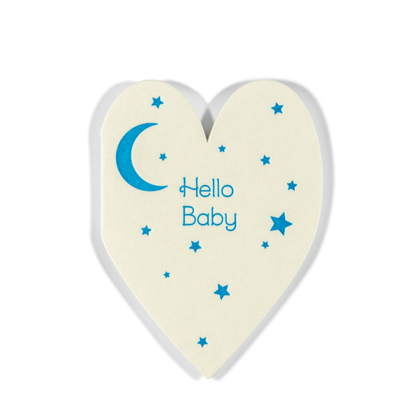 Our mini enclosure cards are a charming way to send a tiny, heartfelt message. Whether tucked inside a baby shower gift, a bouquet, or a welcome-home bundle, they're the perfect add-on when you want to make a moment a little more special. Each card comes with a petite  envelope (2.625” x 3.625”) and is too small to mail on its own. This heart-shaped design features a crescent moon and scattered stars with the message “Hello Baby” in bright blue—an adorable way to welcome a little one.