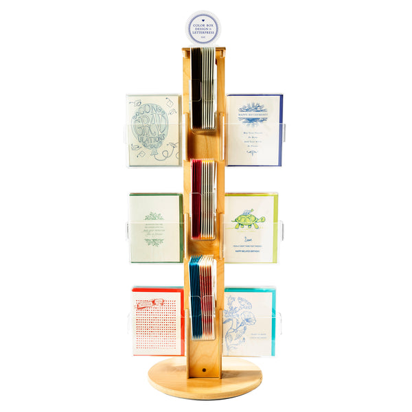 144 cards of choice from our line of greeting cards are included. (6 cards each of 24 designs of your choice) - after purchase, please email Allie@colorboxletterpress.com to send a list of card names along with quantities of cards you would like to order with your display.