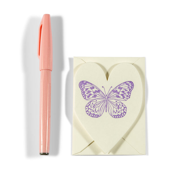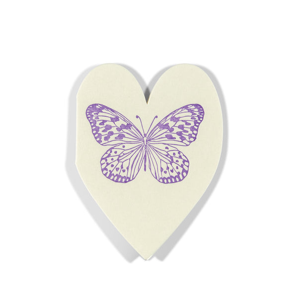 This heart-shaped mini card features a finely drawn purple butterfly—symbolizing transformation, hope, or simply a sweet gesture of beauty. It’s perfect for tucking into a gift, bouquet, or lunchbox, or leaving behind as a little surprise. Each card comes with a petite envelope (2.625” x 3.625”) and is small enough to fit anywhere—but too small to mail.